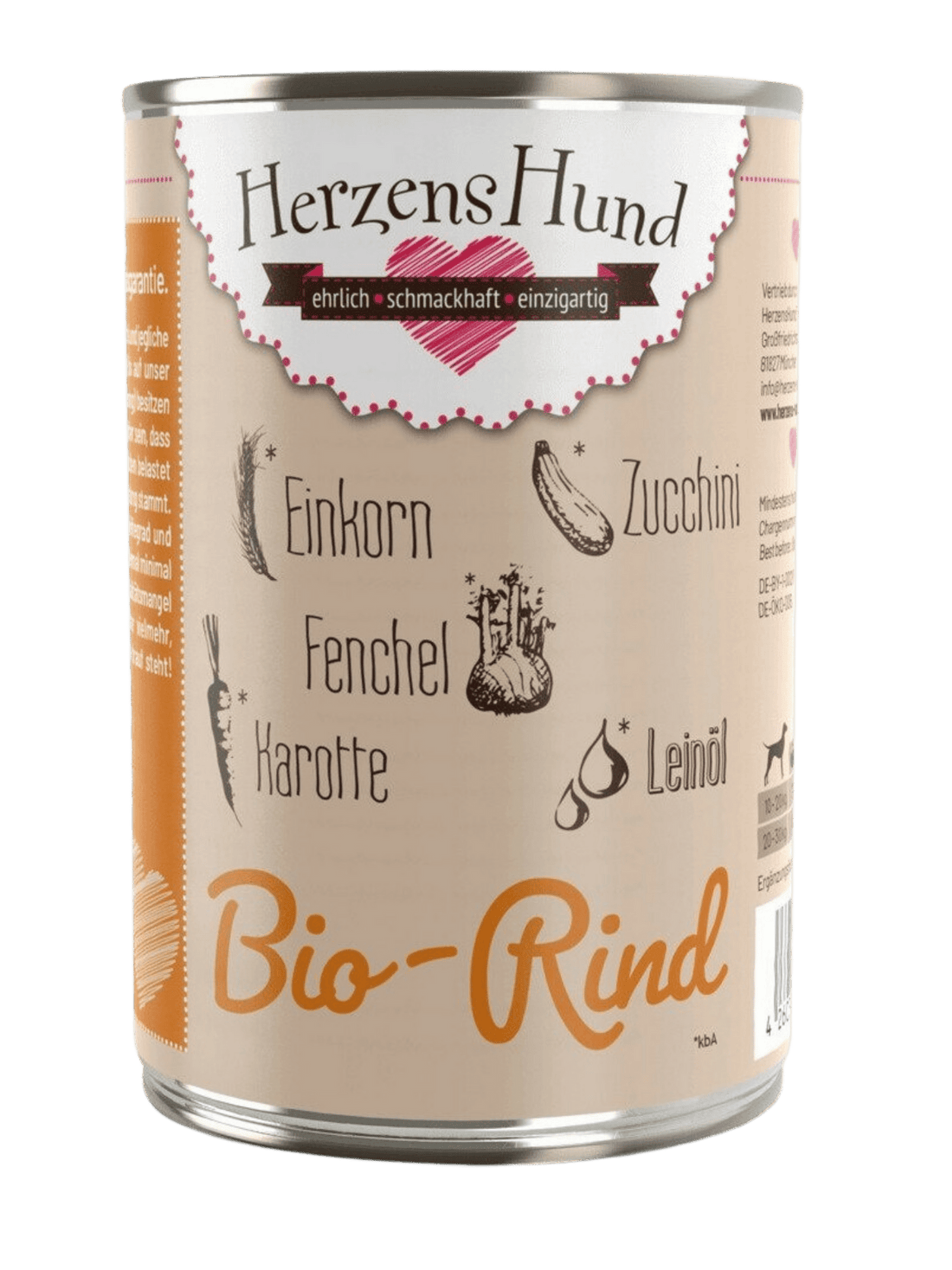 Bio-Rind mit Bio-Gemüse - Ergänzungsfuttermittel für erwachsene Hunde– Bio-Rindfleisch* – Bio-Einkorn* – Bio-Zucchini* – Bio-Karotte*...